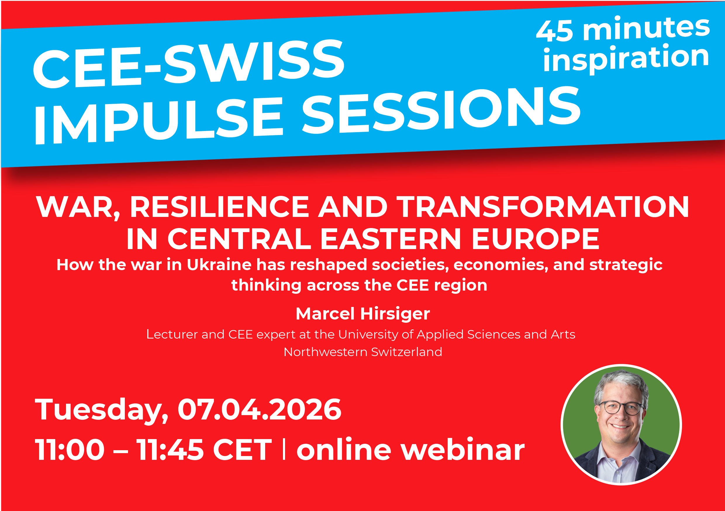 We are glad to invite you to the next CEE-Swiss Impulse Session in cooperation with Chamber of Commerce Switzerland Central Europe (SEC). War, Resilience and Transformation in Central Eastern Europe The war in Ukraine has marked a turning point for Central and Eastern Europe, reshaping societies, economies, and strategic thinking across the region. Join us for a 45-minute insightful session where we explore: ▪️ How the war has accelerated transformation in CEE ▪️ The impact…